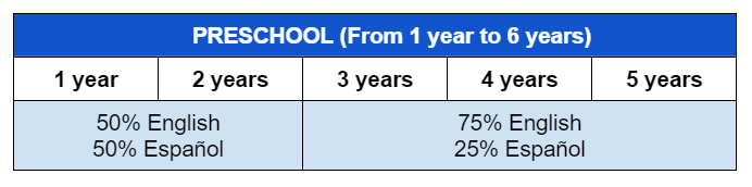 En el 2º ciclo de E. Infantil seguimos un programa bilingüe con el 75% en inglés y el 25% en español. Las niñas y niños conviven con ambos idiomas en el día a día en las diferentes situaciones de aprendizaje, en las que se trabajan de las cuatro habilidades lingüísticas (listening, speaking, reading, writing), adquiriendo las dos lenguas de forma natural a través de actividades lúdicas, la experimentación y la interacción con los adultos y el grupo de iguales.